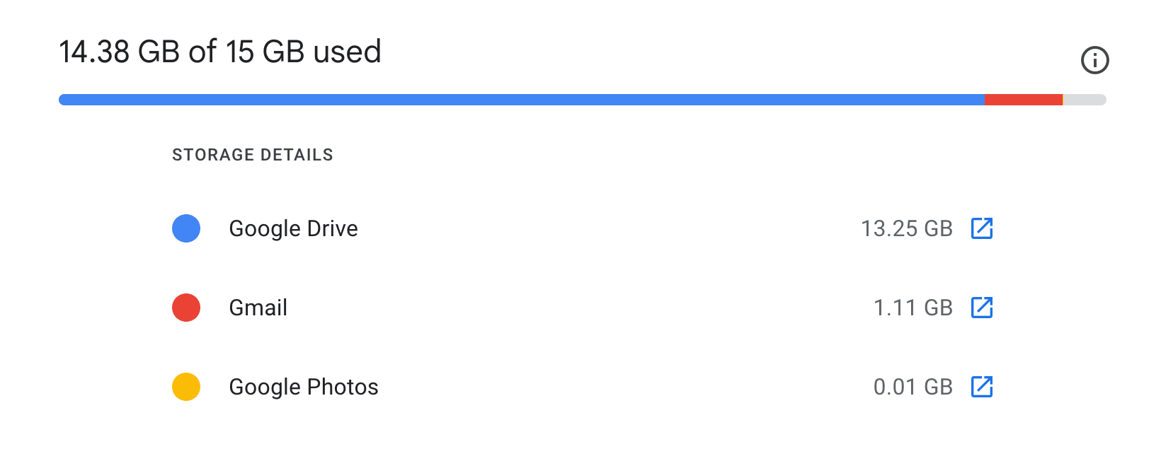 Separately, I stopped using Google Photos around 2017. Accordingly, I eventually moved the pictures and videos I had there elsewhere. The reported usage on Gmail / Google Drive is consistent with that; it shows 0.01GB used.